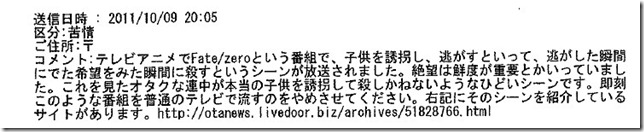 テレビアニメでFate/Zeroという番組で、子供を誘拐し、逃がすといって逃がした瞬間にでた希望を見た瞬間に殺すというシーンが放送されました。絶望は鮮度が重要とかいってました。これを見たオタクな連中が本当の子供を誘拐して殺しかねないようなひどいシーンです。即刻このような番組を普通のテレビで流すのをやめさせてください。右記にそのシーンを紹介しているサイトがあります。http://otanews.livedoor.biz/archives/51828766.html